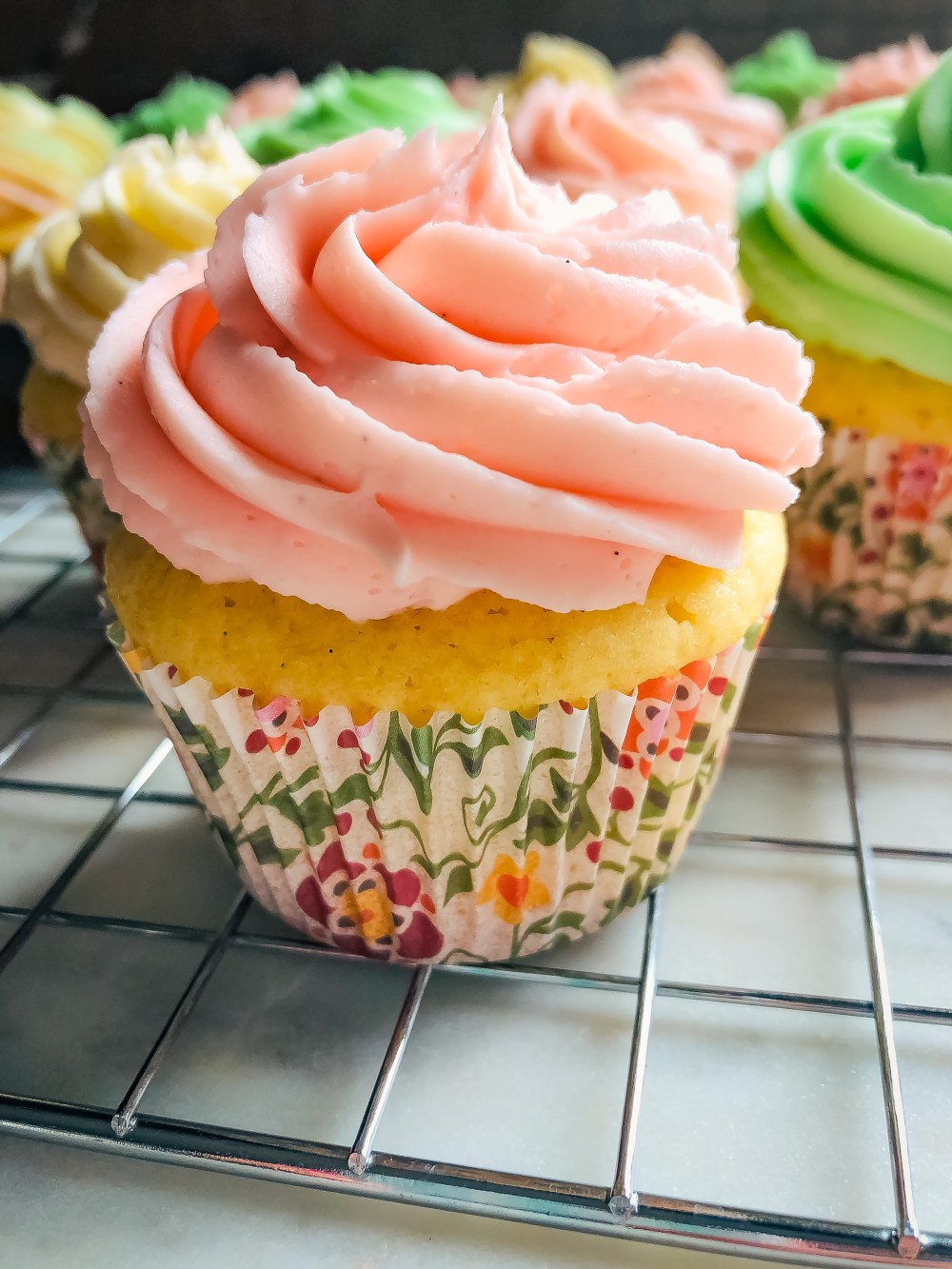 These vanilla cupcakes are one of my favourites because they are so easy to make and very versatile. You can combine them with any flavour (or colour!!) of frosting and they’ll taste great! It’s important to use a good quality vanilla for this recipe because you really want the flavour to stand out. The icing I most often use for these is my classic vanilla frosting.