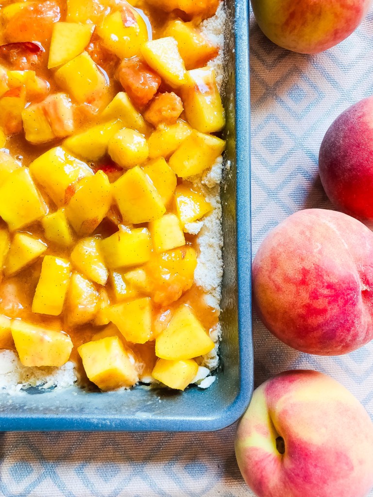 - Spread the filling in an even layer over the prepared crust. Sprinkle the remaining crumble on top of the peaches.