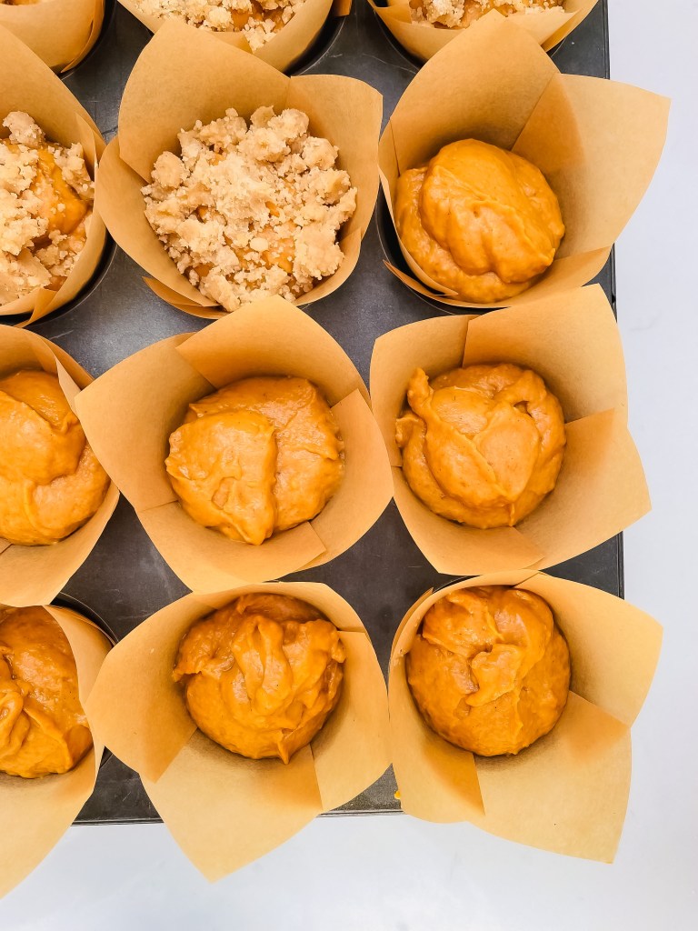 - Divide batter evenly into prepared muffin tin. I like to use a large ice cream scoop for this.