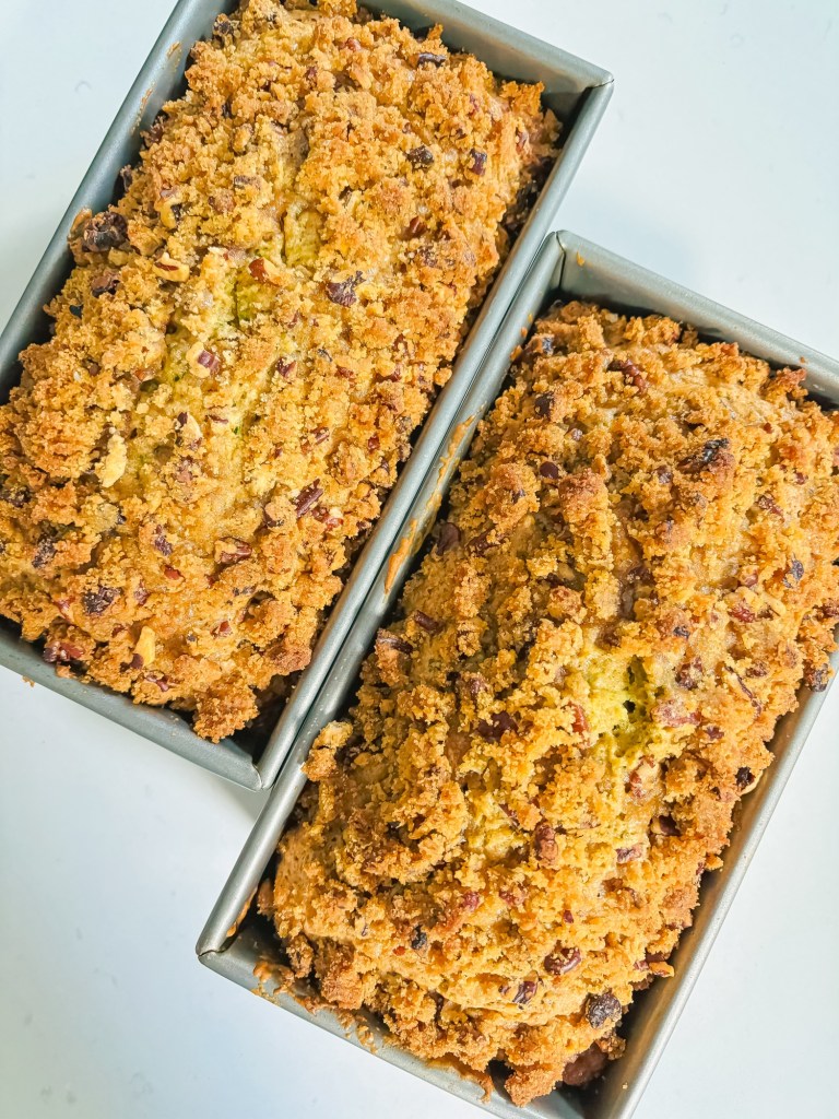 This tasty cake is a delicious take on tradition zucchini bread. Pecans are incorporated both in the batter as well as the sweet and crunchy crumble on top of the cake. I like to add a pinch of coarse sea salt to the crumble topping — it really enhances the texture and sweetness. If you don’t have coarse sea salt, you can simply leave it out. It’s just as delicious without it. Do not substitute with fine sea salt or table salt. It will make your topping too salty.
