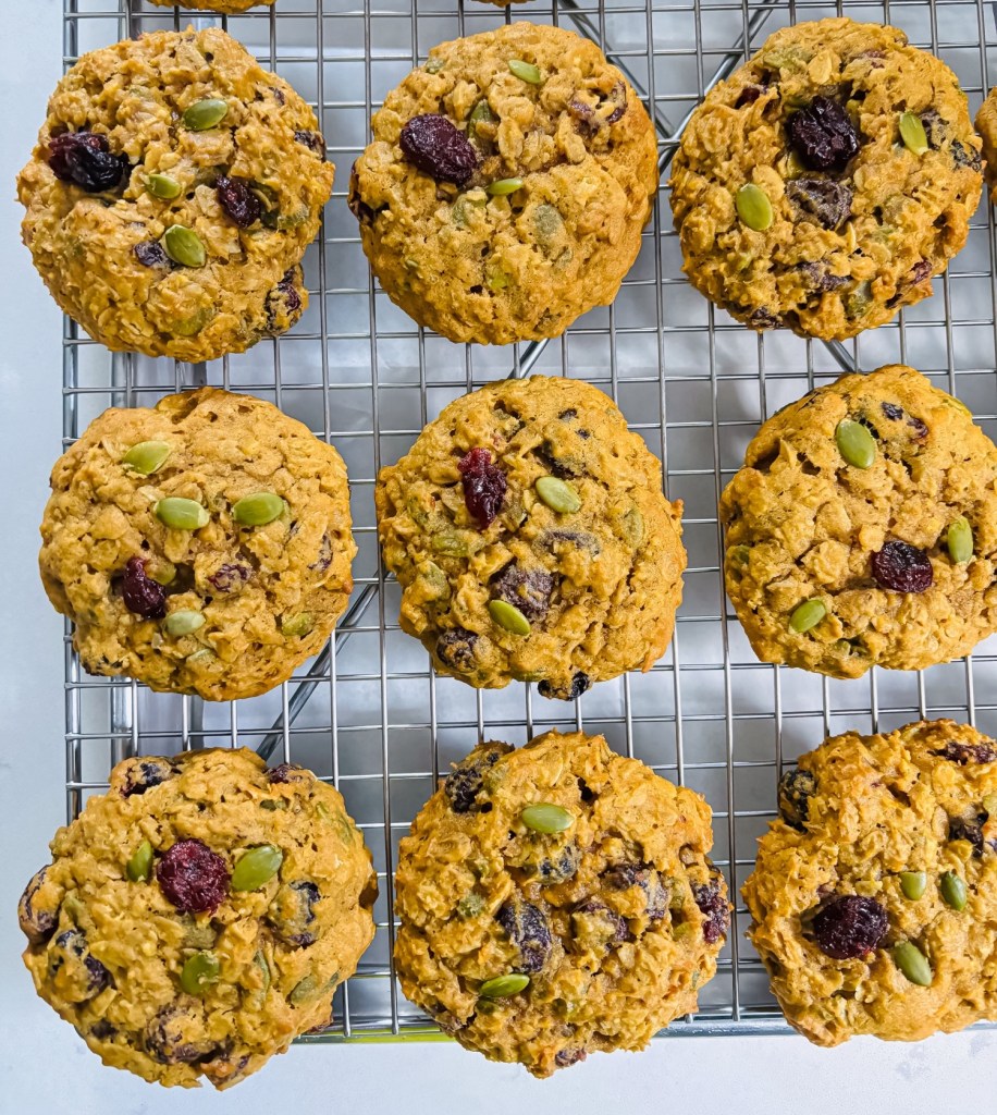 This cookie is an autumn version of my Big and Chewy Oatmeal Cookies. The cranberries add a nice tartness and pop of colour to these cookies, while the pumpkin seeds add texture and crunch. I also add some cinnamon or pumpkin pie spice to give them some extra fall flavour.