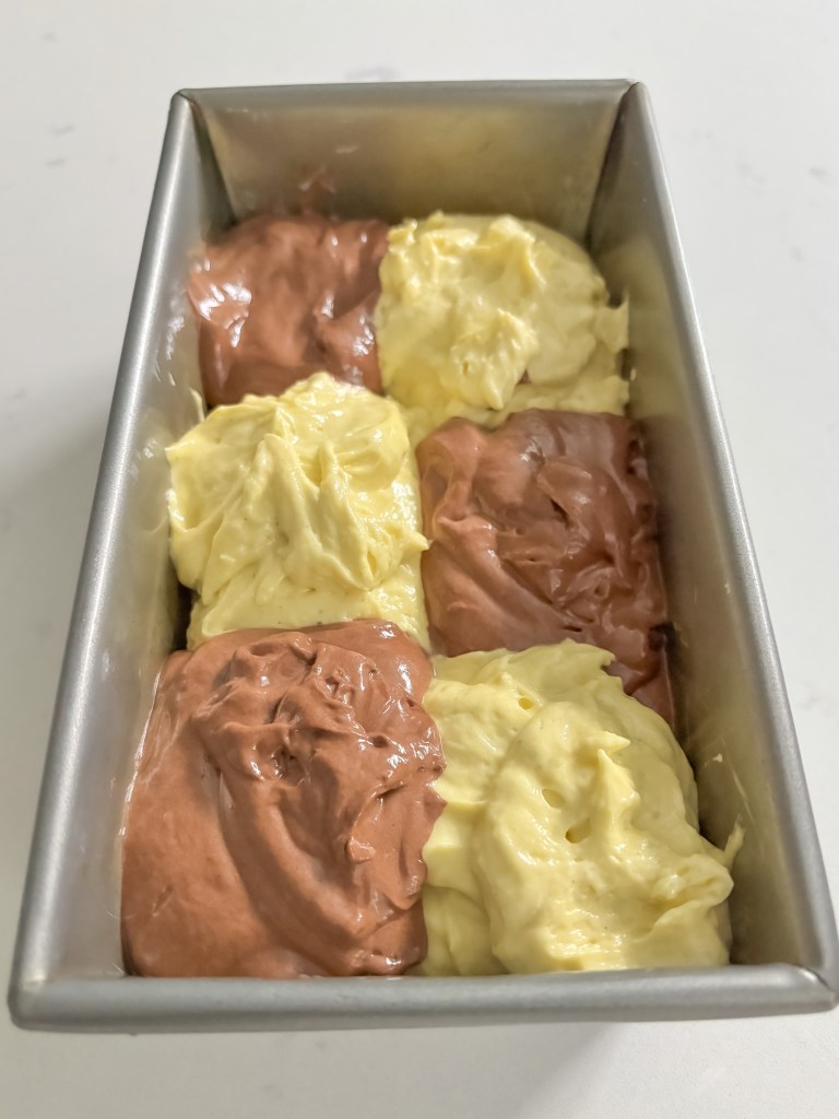 - Spoon the batters into the prepared pan, alternating spoonfuls of vanilla and chocolate.